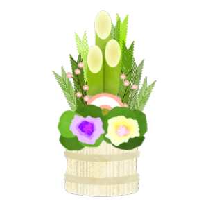 梅・扇子飾り付き門松のイラスト Ilustração de um kadomatsu com flor de Ume (ameixa japonesa) e Sensu(leque)